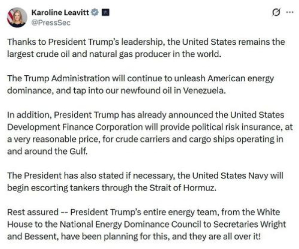 «Благодаря лидерству президента Трампа Соединенные Штаты остаются крупнейшим в мире производителем сырой нефти и природного газа. Администрация Трампа продолжит укреплять доминирование американской энергетики и использовать нашу вновь доступную нефть из Венесуэлы. Кроме того, президент уже объявил, что U.S. Development Finance Corporation предоставит политическое страхование рисков по очень разумной цене для танкеров с нефтью и грузовых судов, работающих в регионе залива и вокруг него. Президент также заявил, что, если потребуется, военно-морские силы США начнут сопровождать танкеры через пролив Ормуз. Будьте уверены — вся энергетическая команда президента, от администрации до Национального совета по энергетическому доминированию и министров Райта и Бессента, планировала это заблаговременно, и они полностью контролируют ситуацию!» — заявила Каролин Ливитт.